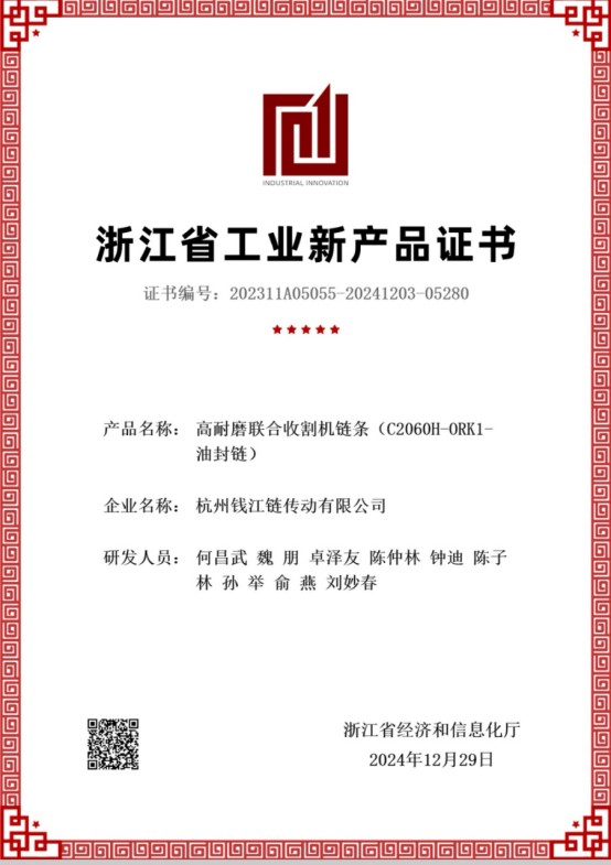 La chaîne à haute résistance à l'usure pour les machines de récolte agricole obtient la certification de niveau provincial
