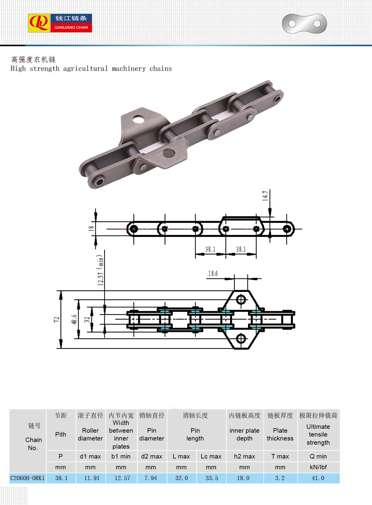 Les chaînes de machines agricoles à haute résistance ont une résistance à l'usure, une résistance et une durée de vie et conviennent à diverses conditions de travail complexes. Des matériaux en acier allié de haute qualité sont utilisés, et la résistance à la traction et la durée de vie de la chaîne sont améliorées grâce à des processus de traitement thermique (tels que la cémentation, la trempe et la trempe). La surface de contact de la chaîne est spécialement durcie, avec une surface lisse et une bonne résistance à l'usure, adaptée aux travaux à haute fréquence. La technologie de traitement de précision garantit que les maillons de la chaîne sont étroitement adaptés, fonctionnent sans problème et réduisent le bruit et les vibrations. Une variété de pas, de résistances et de formes (telles que les chaînes à rouleaux, les chaînes pour accessoires, les chaînes à plaques pliées, etc.) peuvent être personnalisées en fonction des besoins de support des différentes machines et équipements agricoles. Utilisé dans le mécanisme de transmission pour le transport, la coupe et le battage des récolteuses de blé, de riz, de maïs, etc. L'entraînement du disque de semis et de l'arbre d'engrais nécessite que la chaîne fonctionne avec précision et de manière durable. Appliqué aux bandes transporteuses agricoles, aux élévateurs de matériaux, etc., pour entreprendre des tâches de transport à haute fréquence.